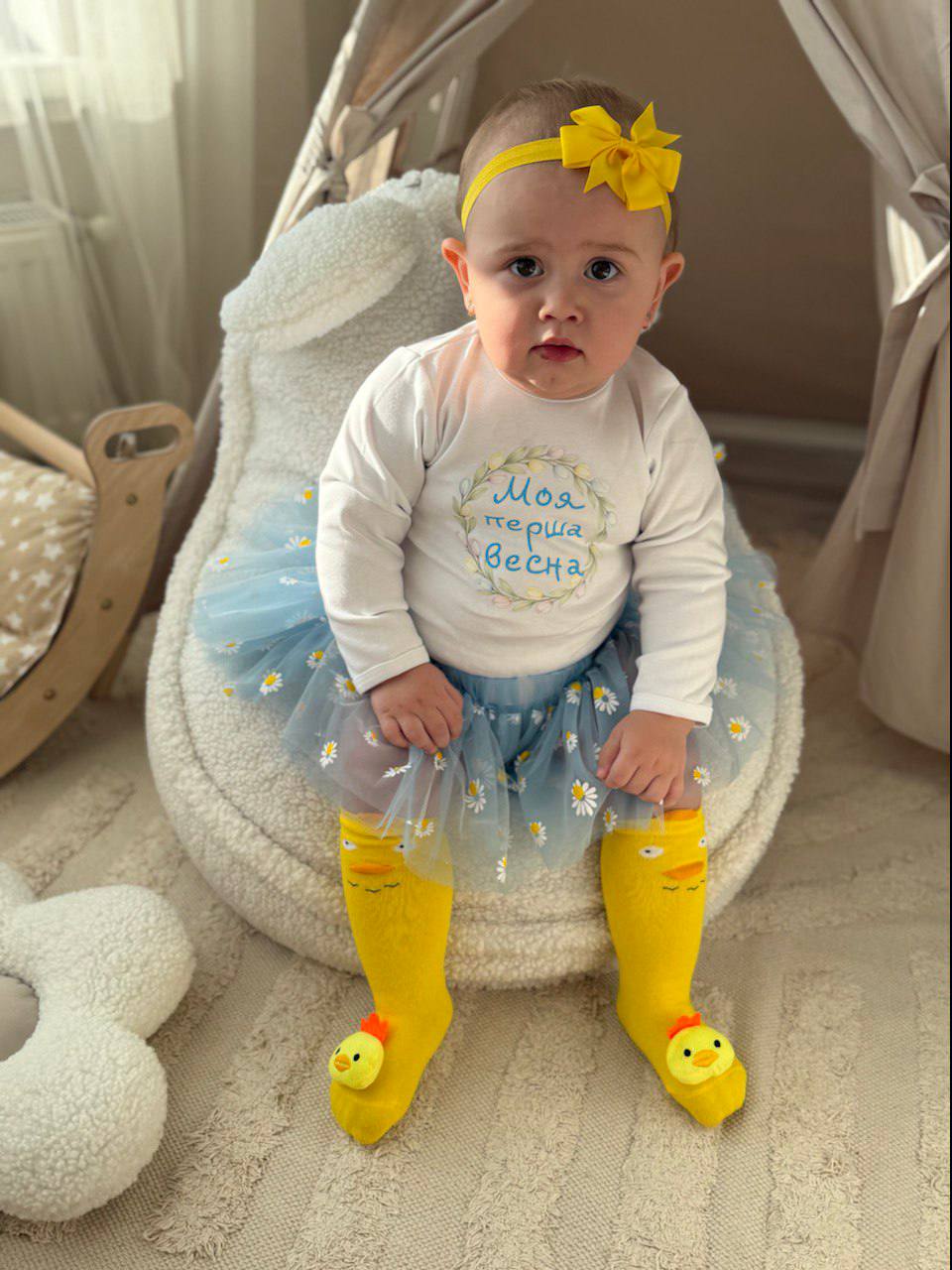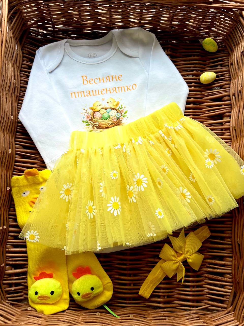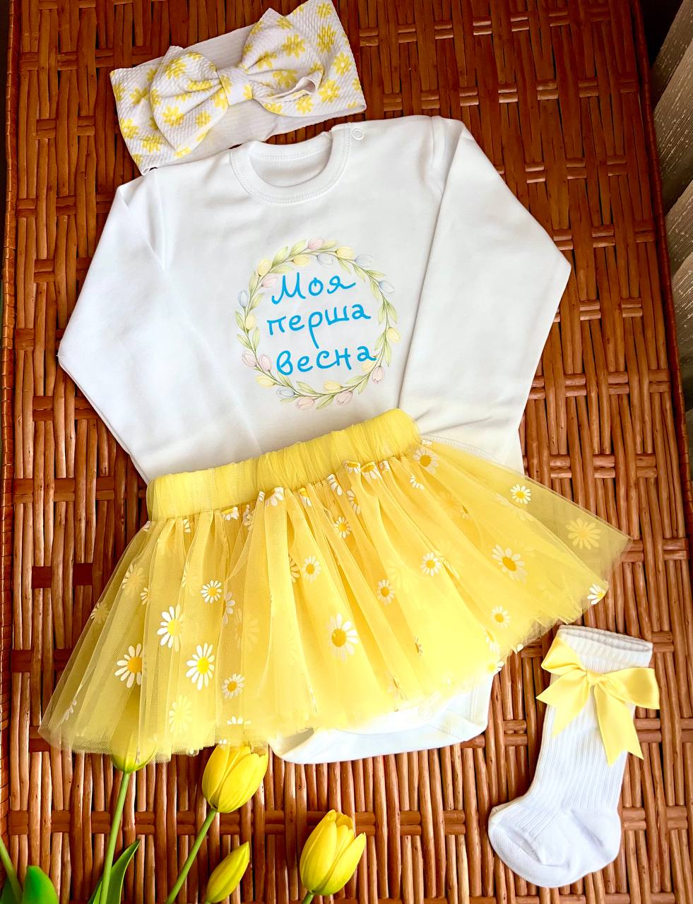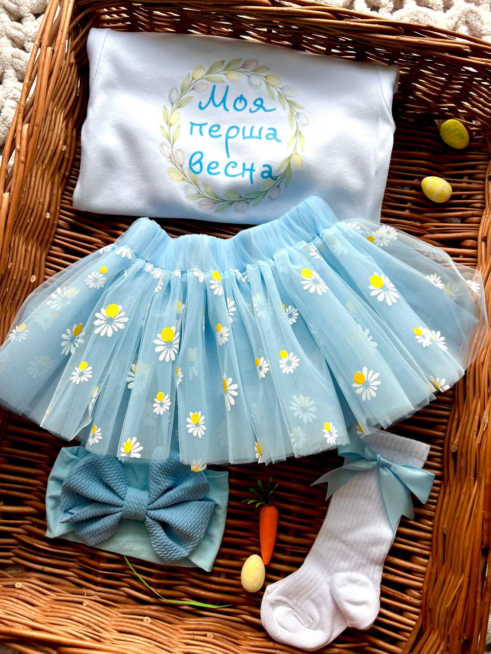 Ніжна, легка та дуже святуова спіничка для маленьких модниць. Виконана з мякого фатну-євросітки. Принти ромашок по-справжньому сворюють весняний образ.